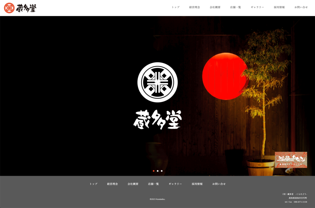 home > 実績 > Kuratado – Corporate Website works 実績 all すべて branding ブランディング graphic グラフィックデザイン package パッケージデザイン web ウェブデザイン illustration イラスト birthday board バースデーボード picture book オリジナル絵本 web Kuratado – Corporate Website https://kuratadou.com/ We created the corporate website for Kuratado, an izakaya operator in Kochi. They run an izakaya (Japanese pub) that offers a variety of creative dishes, focusing on local cuisine. back to index>